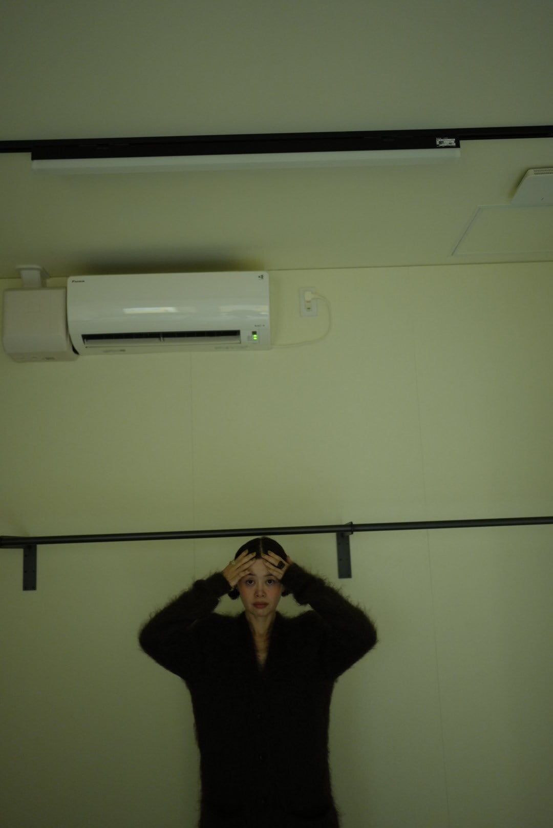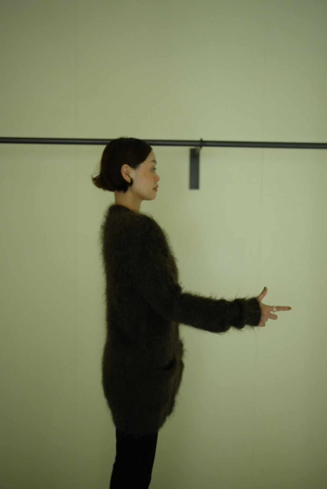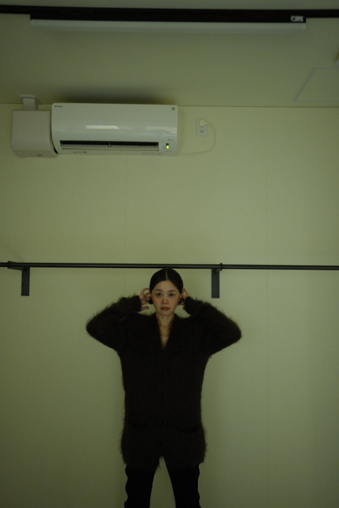 モヘア高混率の糸を片畦で編み(片畦とはニットの編み方の一種で片面をゴム編みもう片面をタックで編むことで立体感と凹凸感のある編み地を作る技法です)