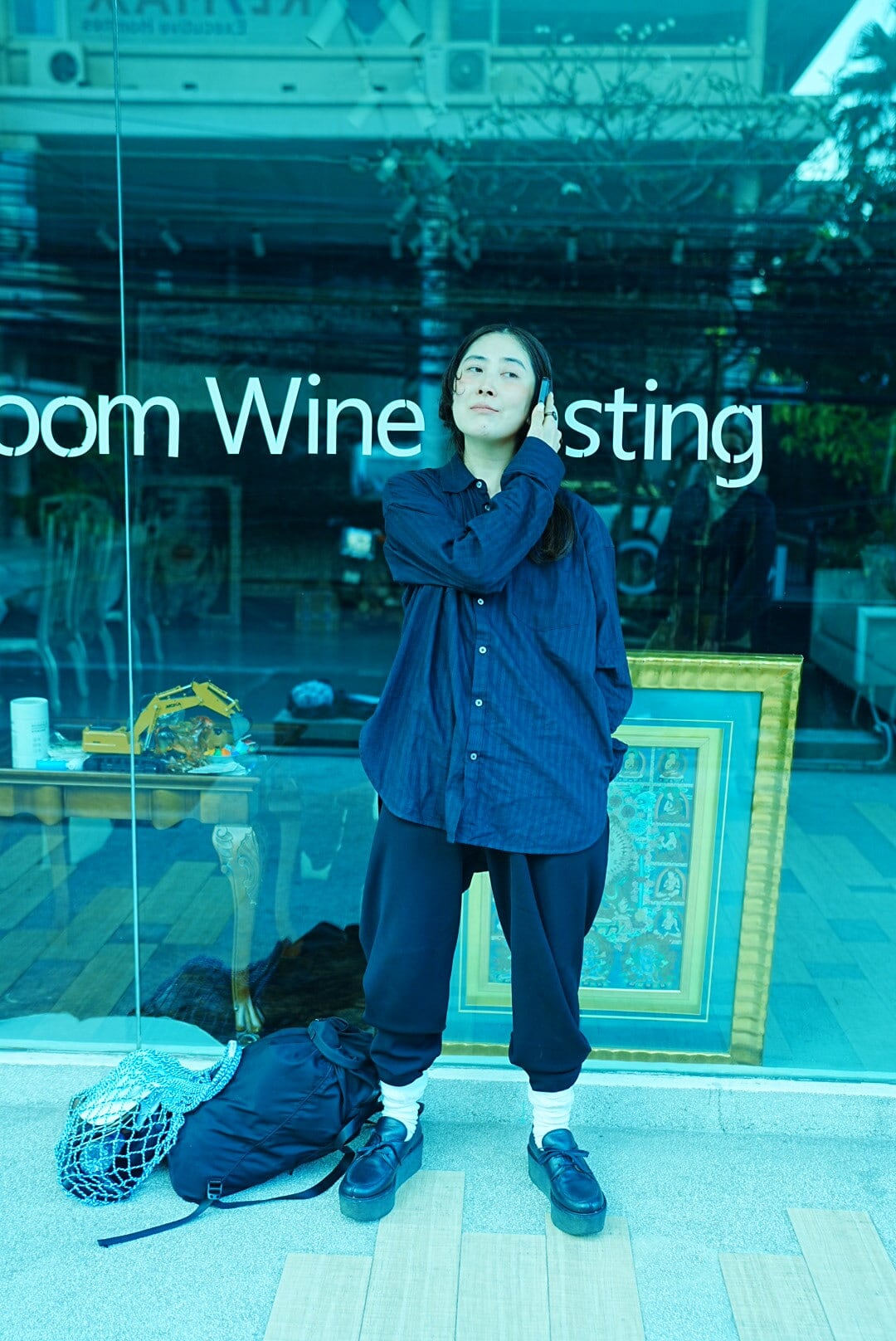 organic khadi cottonの black stripeで SKYのシャツを作りました
